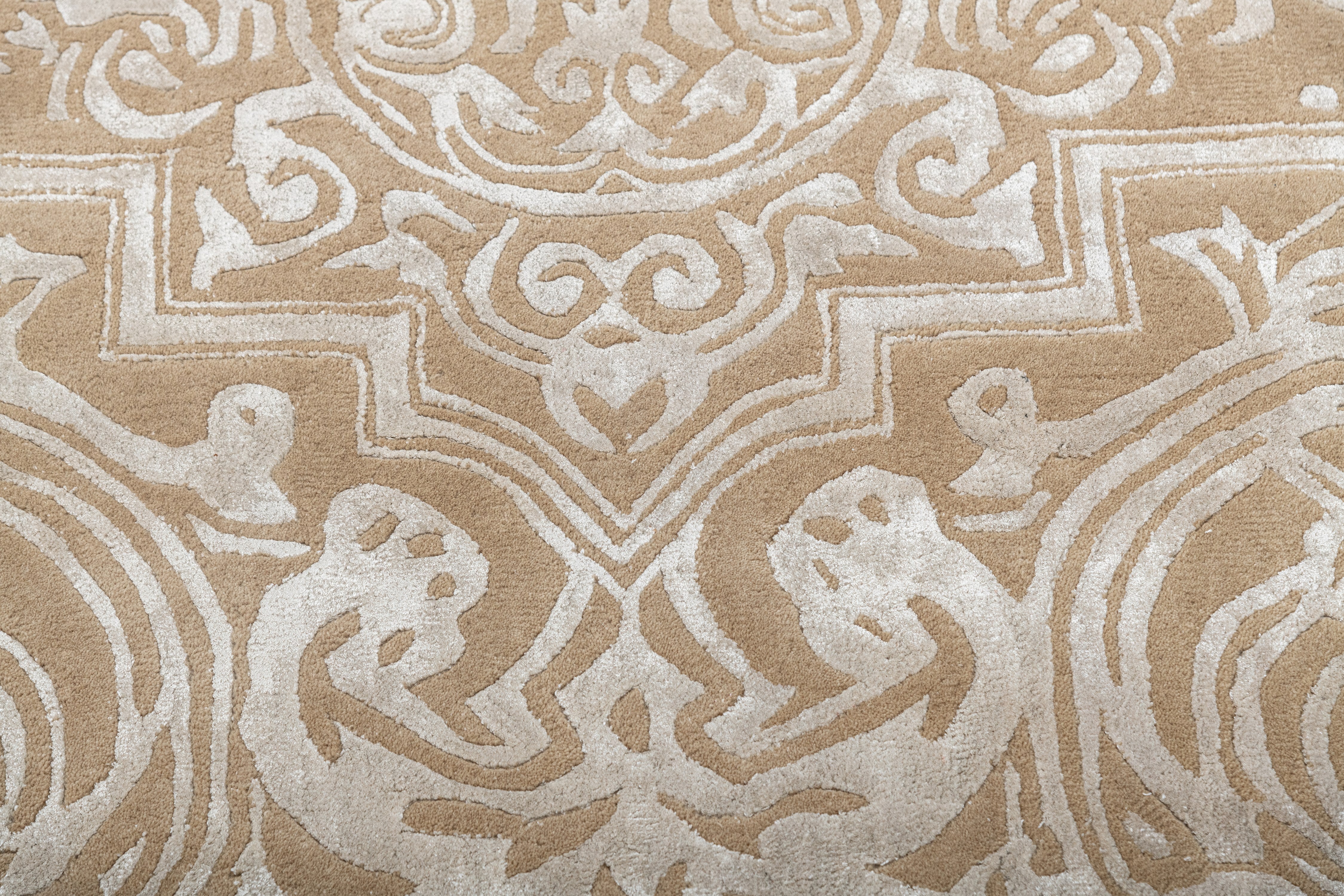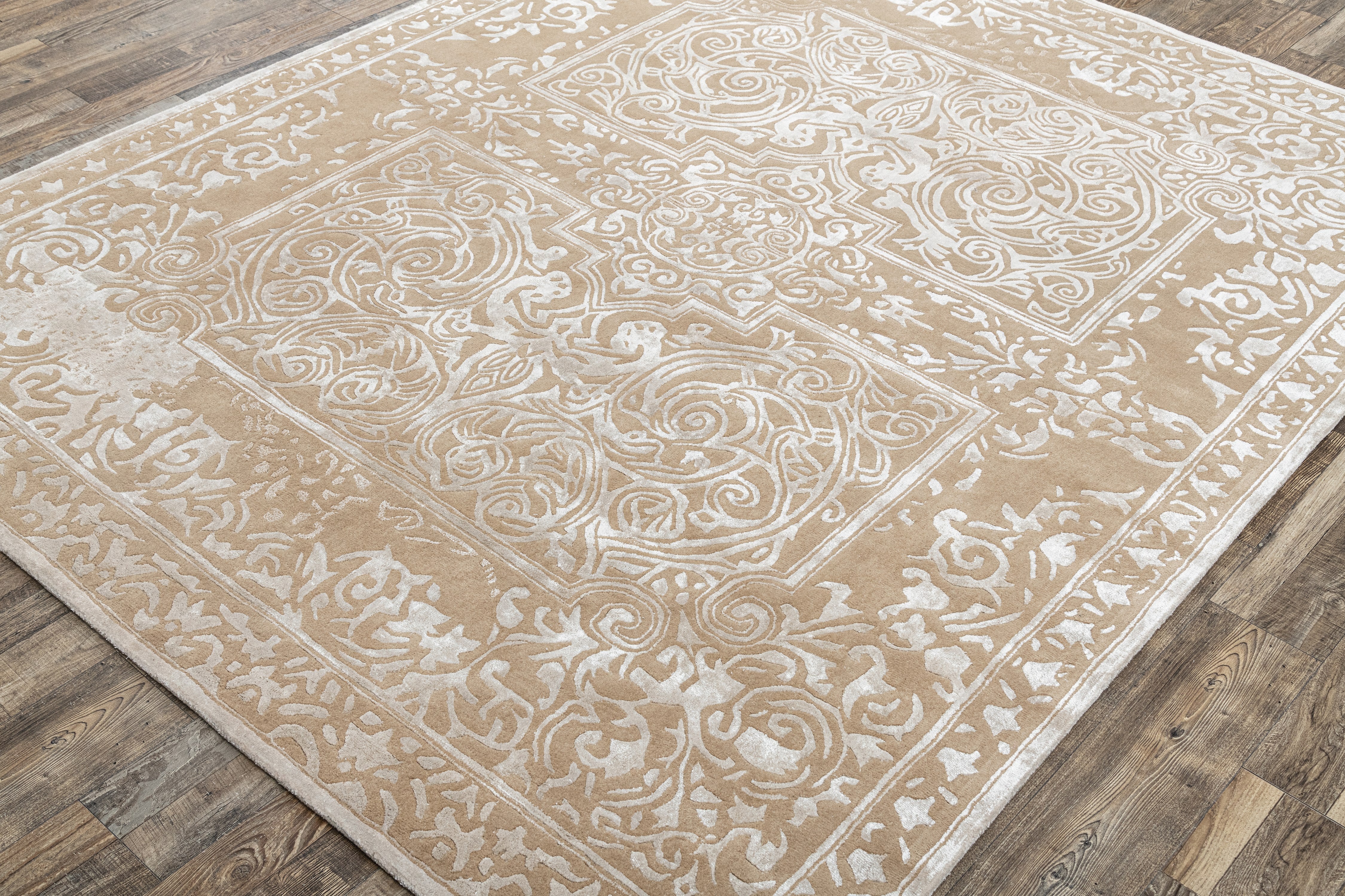 Pot-dyed wool and bamboo silk, sun-dried for rich, colorfast hues. Soft underfoot, breathable, naturally resilient, and easy to live with.